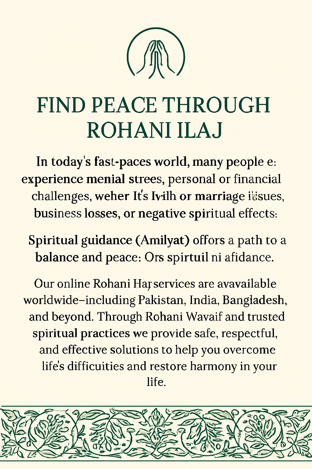 Our online Rohani Ilaj services are open for people worldwide, including Pakistan, India, Bangladesh, and other countries. Through Rohani Wazaif and trusted spiritual methods, we help you deal with life’s challenges in a safe and respectful way.